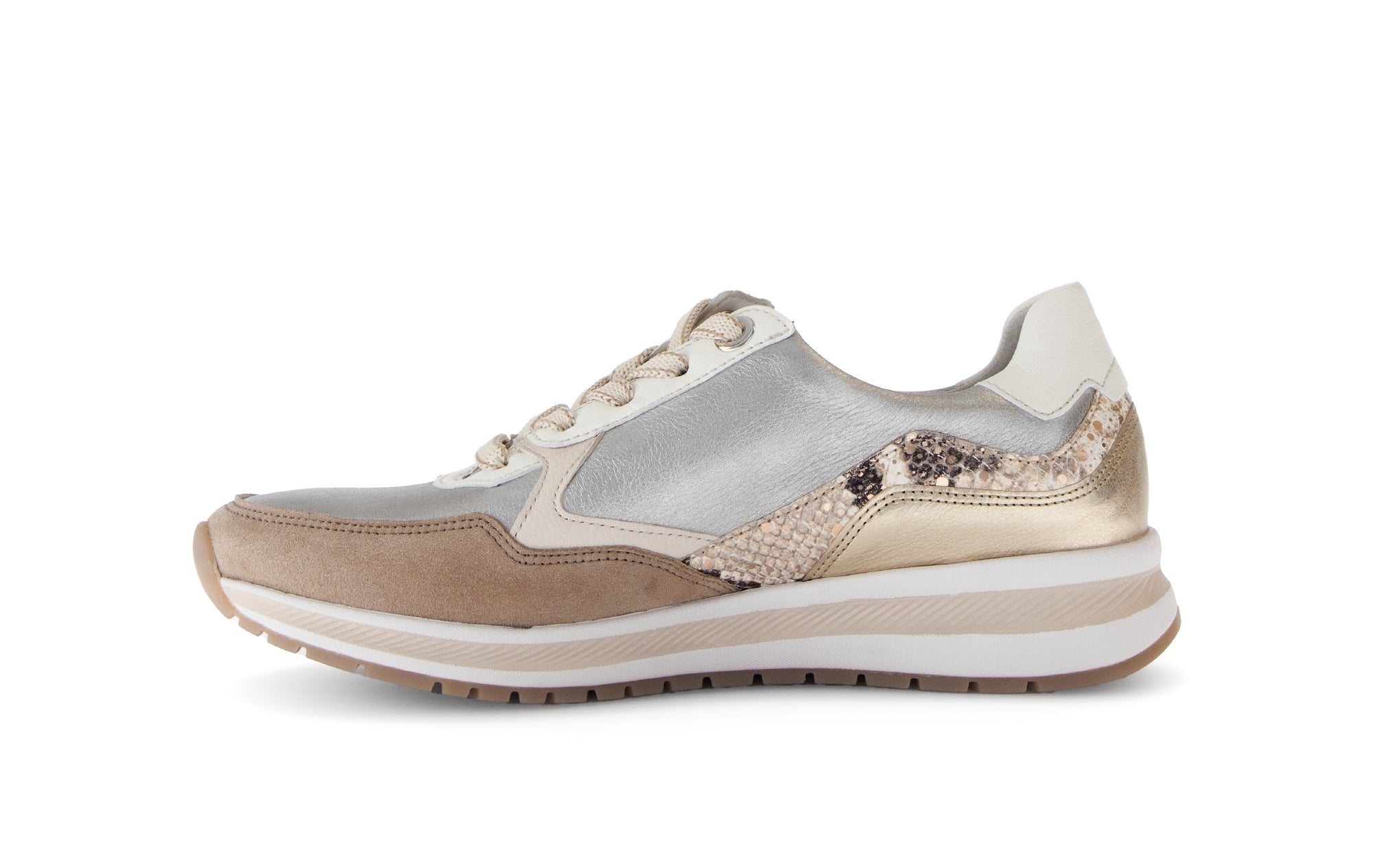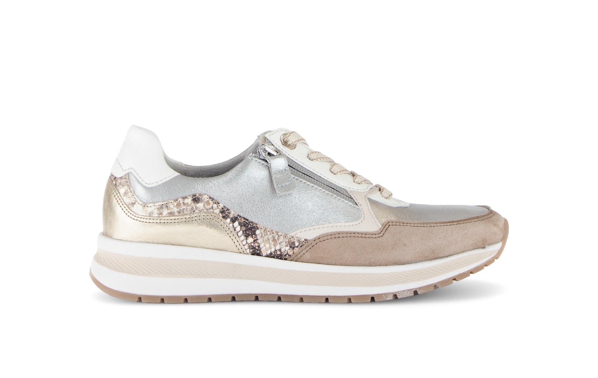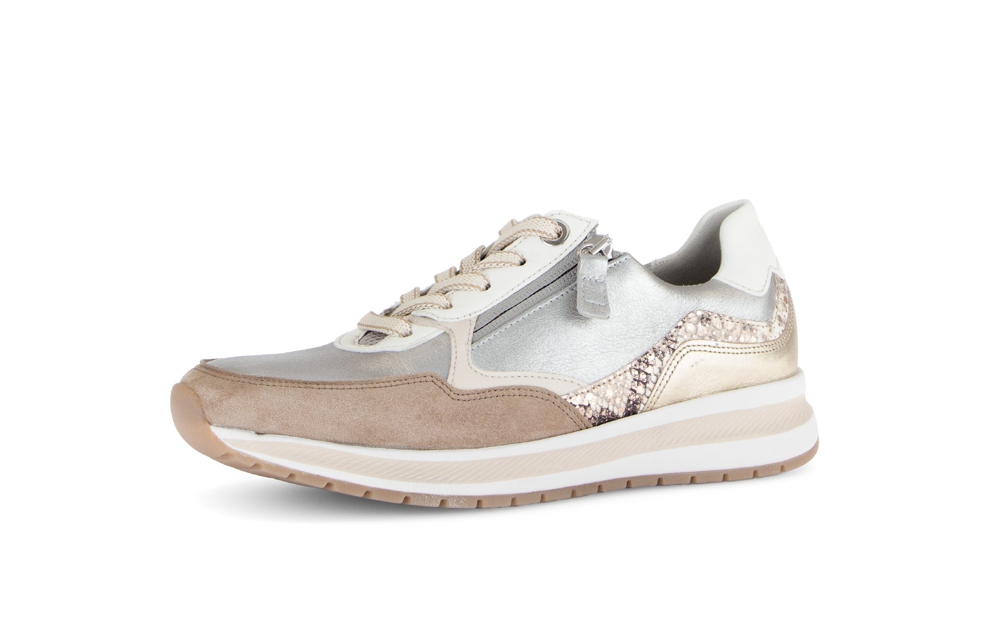Cette nouvelle Basket Gabor est un condensé du savoir faire de la marque : réalisée en largeur confortable G, elle dispose d'une Semelle amovible cuir et d'une semelle gomme souple de 15 mm de hauteur compensée. Multi Matières et multicoloris, elle saura vous plaire par son look et vous convaincre par son confort. Une fermeture éclair vous garantit un chaussant facile et optimal. A essayer, absolument... puis à adopter, bien sur !